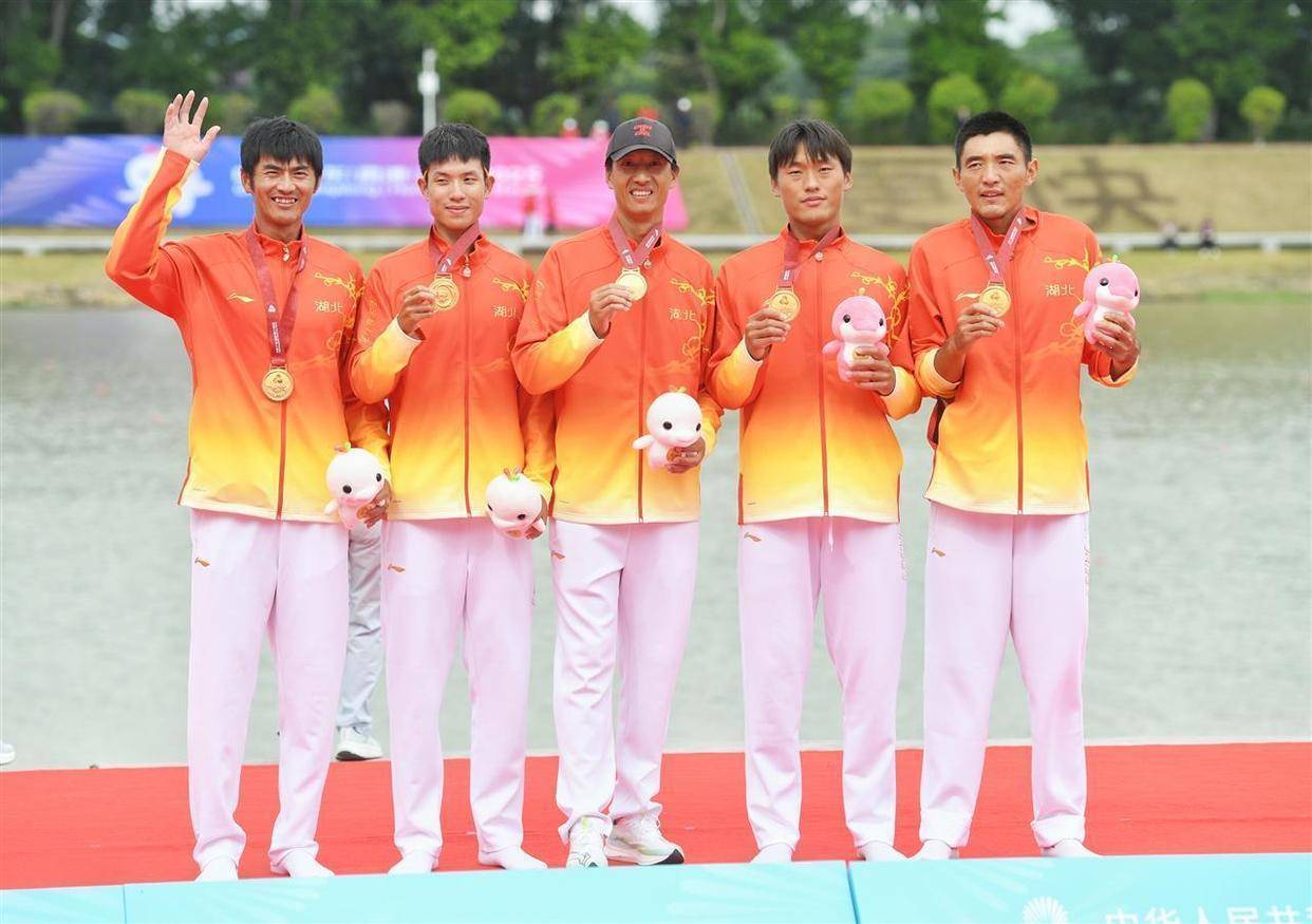 第十五届全运会男人四东谈主单桨1500米决赛,潜江籍通顺员孙露(右一)与队友李文雷、张璐通、刘治宇,以4分20秒67的佳绩勇夺冠军。