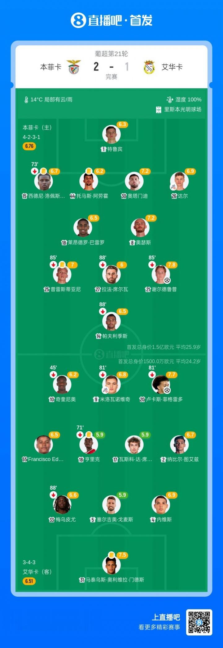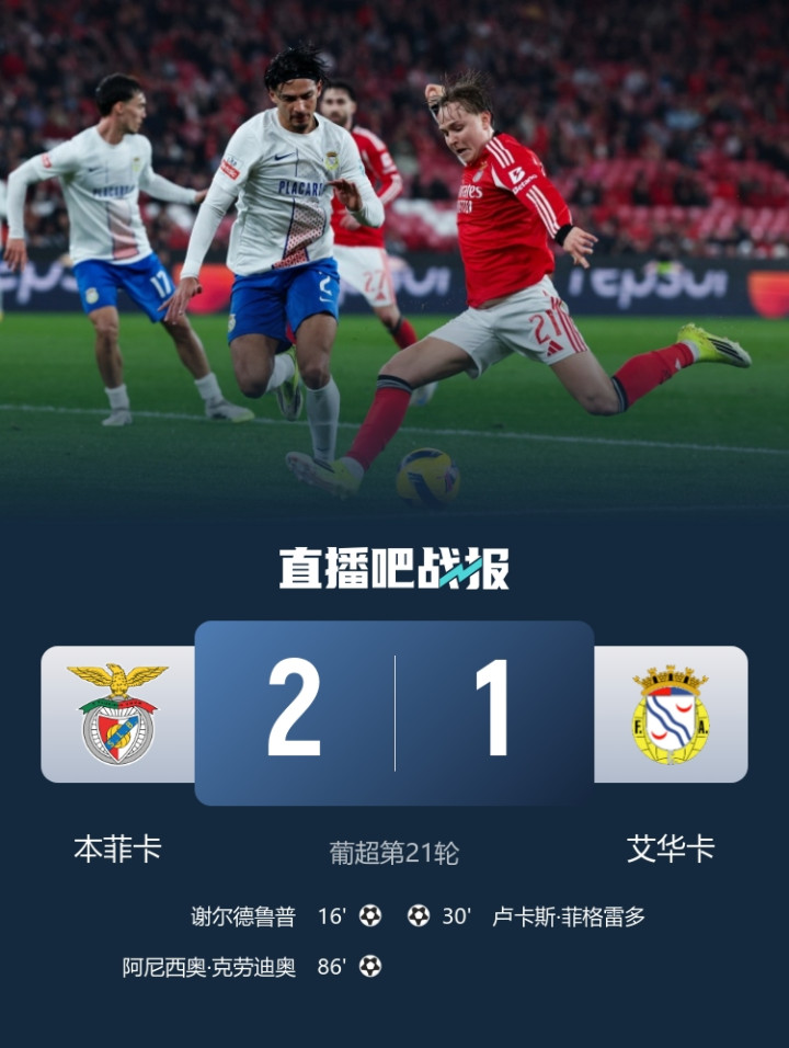 直播吧02月09日讯葡超第21轮,本菲卡镇守光明球场迎战艾华卡。上半场第16分钟,谢尔德鲁普补射破门首开记载。第30分钟,米洛瓦诺维奇助攻,卢卡斯·菲格雷多扳平比分。下半场第86分钟,阿尼西奥·克劳迪奥替补登场1分钟头球破门,达尔助攻。最终,本菲卡2-1艾华卡。积分榜方面体育赛事直播,本菲卡以49分仍然排在第3位,先赛距榜首6分;艾华卡积24分排在第10位。